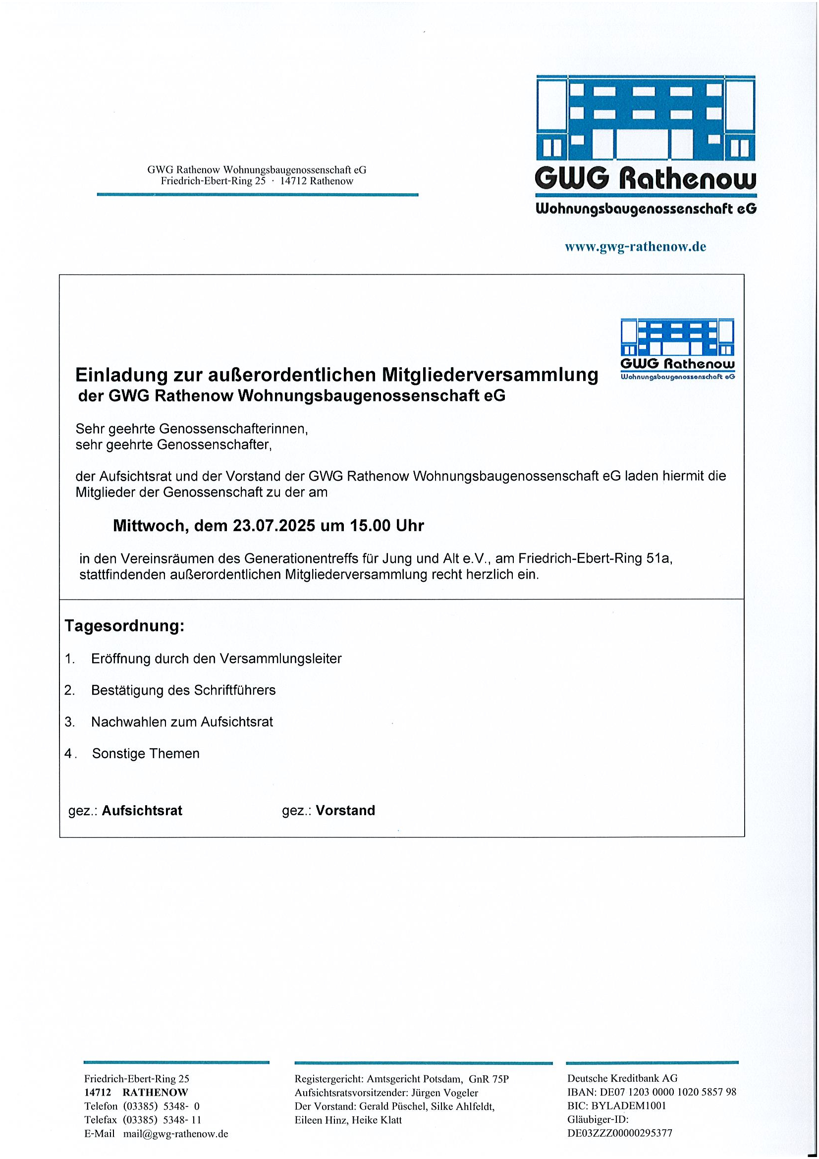 Einladung zur außerordentlichen Mitgliederversammlung